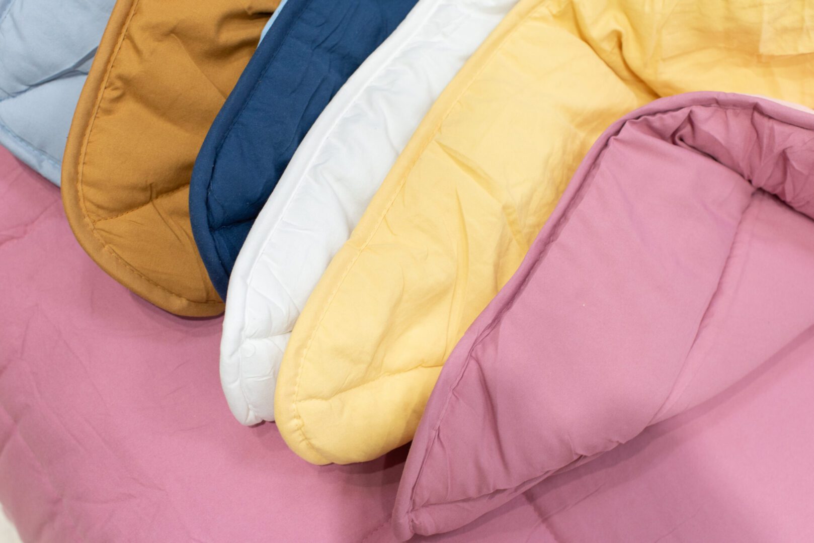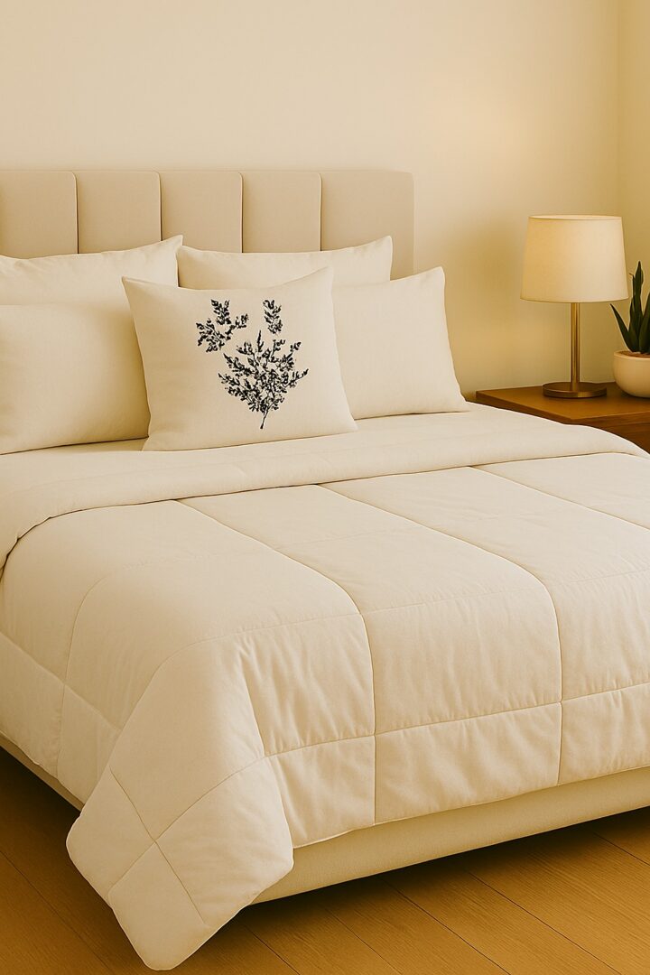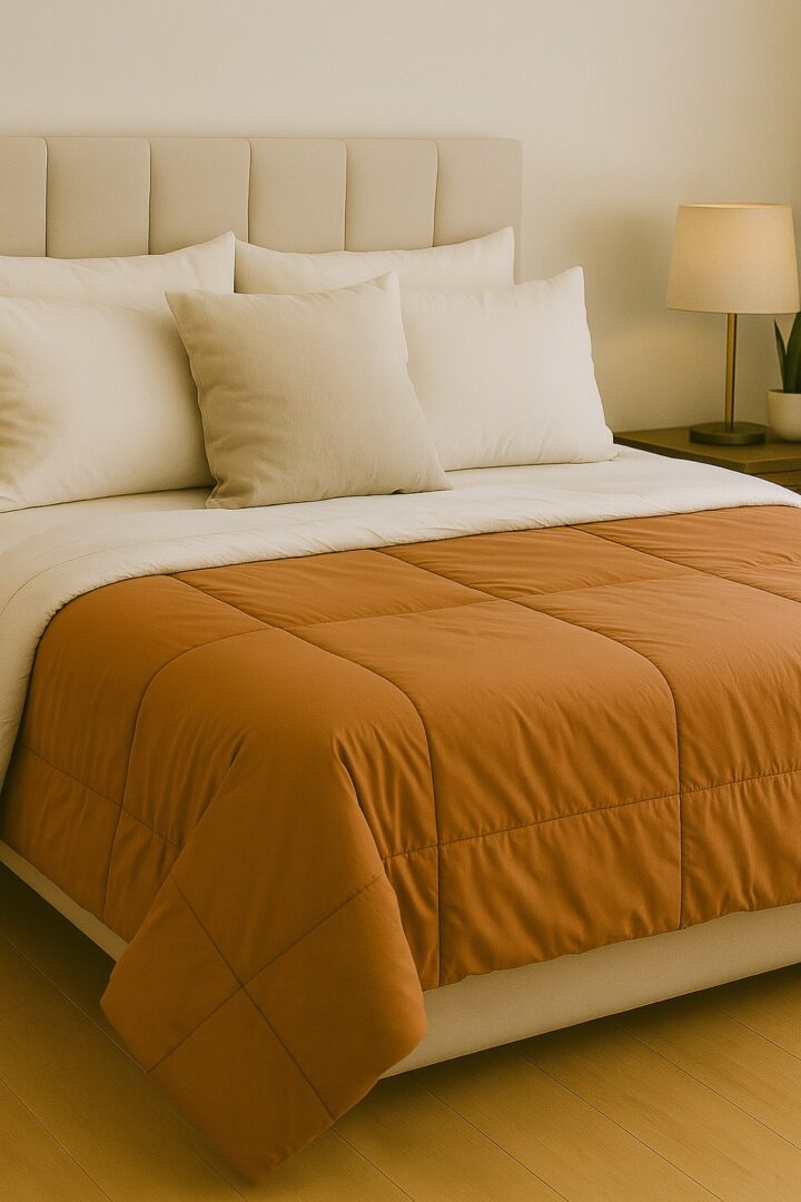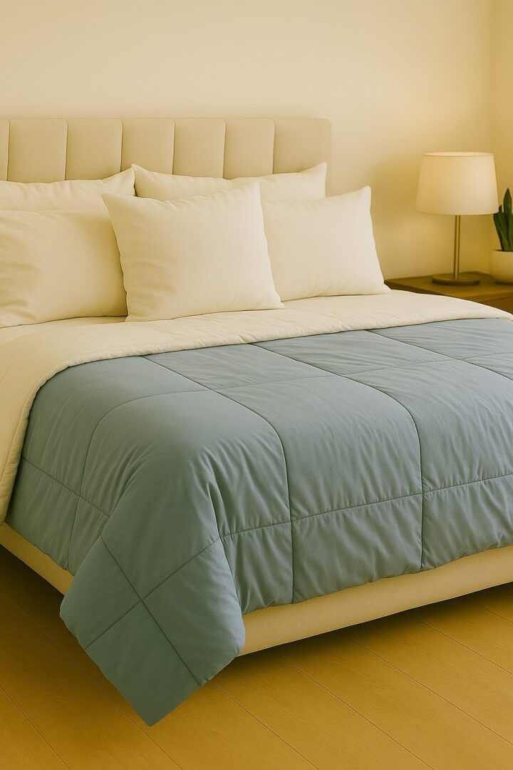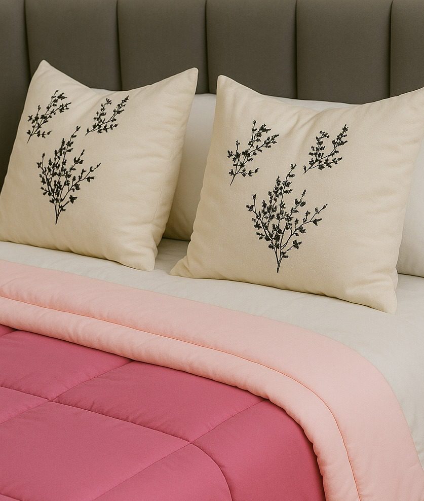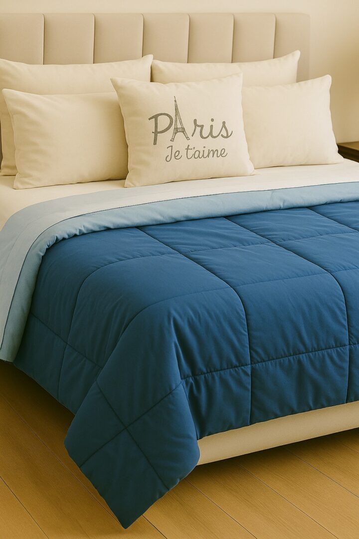 Composición: Acolchado reversible confeccionado en tela esmerilada que le da una apariencia de cotton touch. Relleno de vellón siliconado 300 gsm.