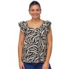 Su diseño incluye mangas cortas con volados, que aportan un detalle femenino y delicado, mientras que la estampa integral crea un estilo llamativo y actual. El escote redondo clásico equilibra la silueta y permite combinarla fácilmente con jeans, pantalones lisos o faldas.