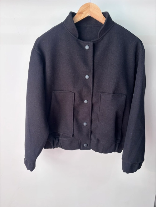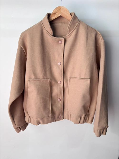 Campera de paño tipo bomber con bolsillos aplicados y elastico en la cintura. Botones snaps al tono
