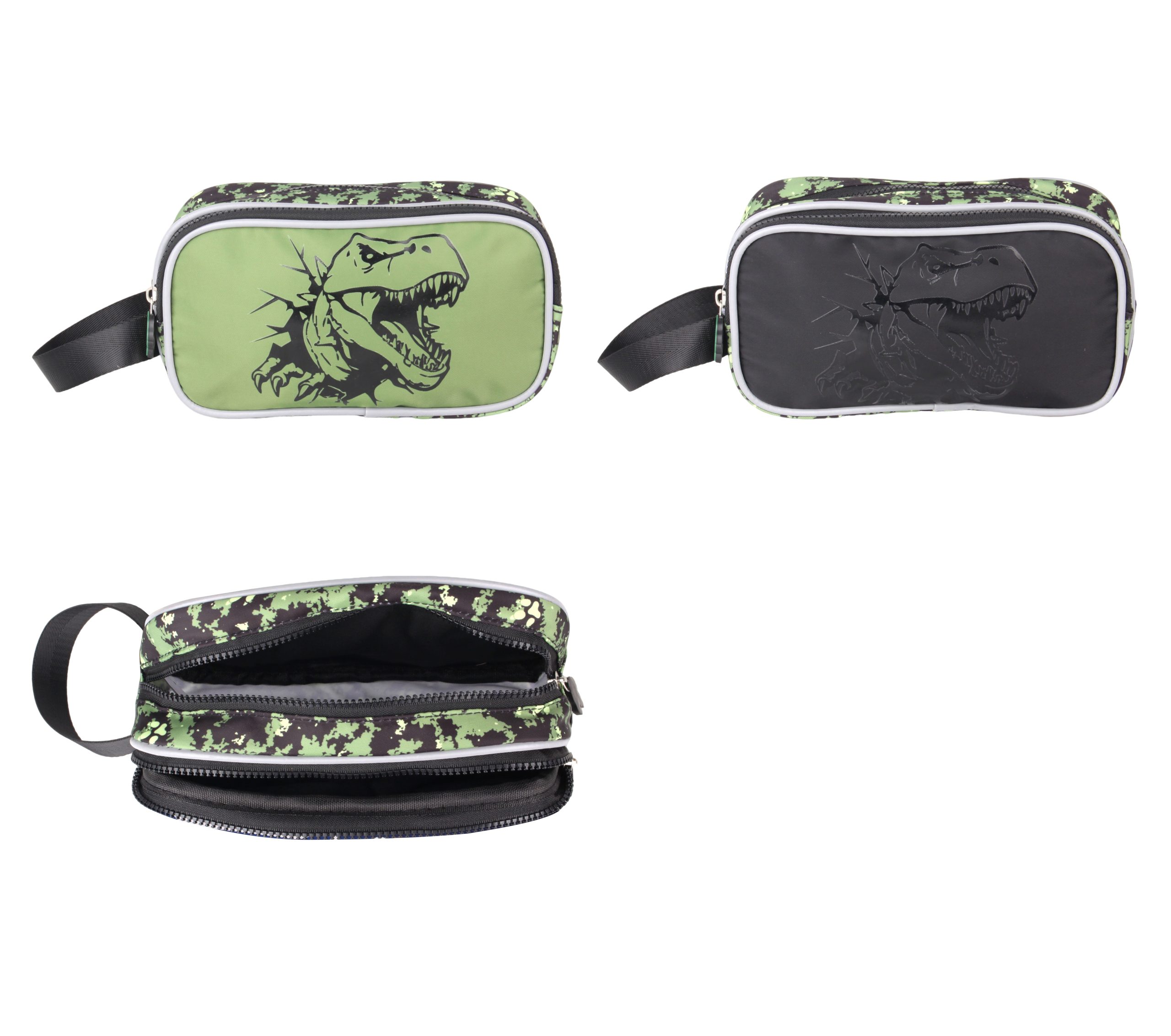 Cartuchera escolar infantil con doble compartimento, ideal para mantener los útiles ordenados y al alcance. Diseñada con estampado de dinosaurio, combina un estilo atractivo con materiales resistentes para el uso diario escolar.