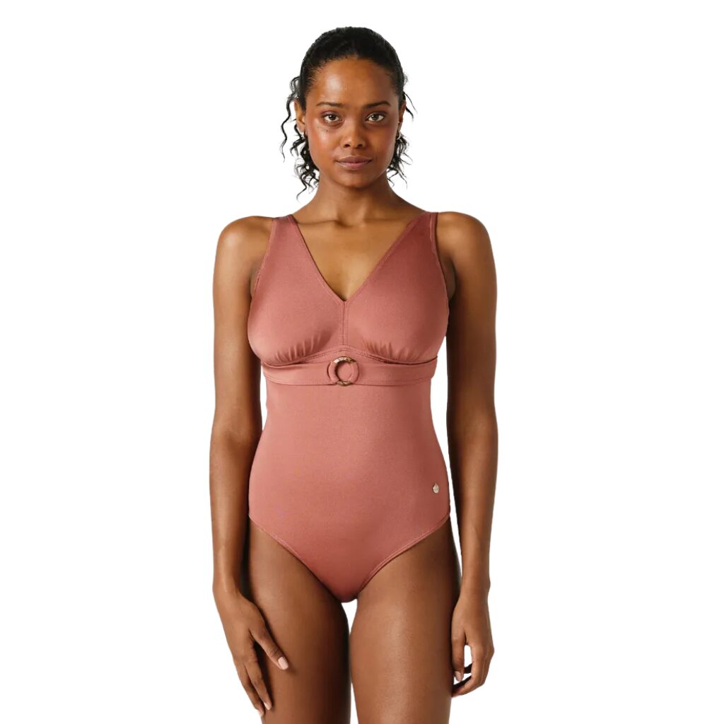 Su escote en V estiliza visualmente el torso, mientras que el cinturón integrado con hebilla decorativa marca la cintura y aporta un detalle moderno y sofisticado. La parte inferior tiene una cobertura clásica y cómoda, ideal para moverse con libertad en playa o pileta.