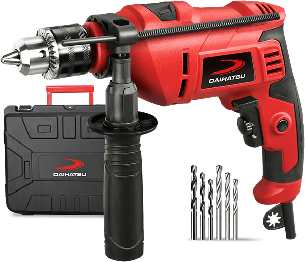 Taladro de impacto de 500W. – Soporta mechas de 13 mm – Control de velocidad variable – Funciones de reversa y percutor – Traba para operación continua – Diseño ergonómico y robusto