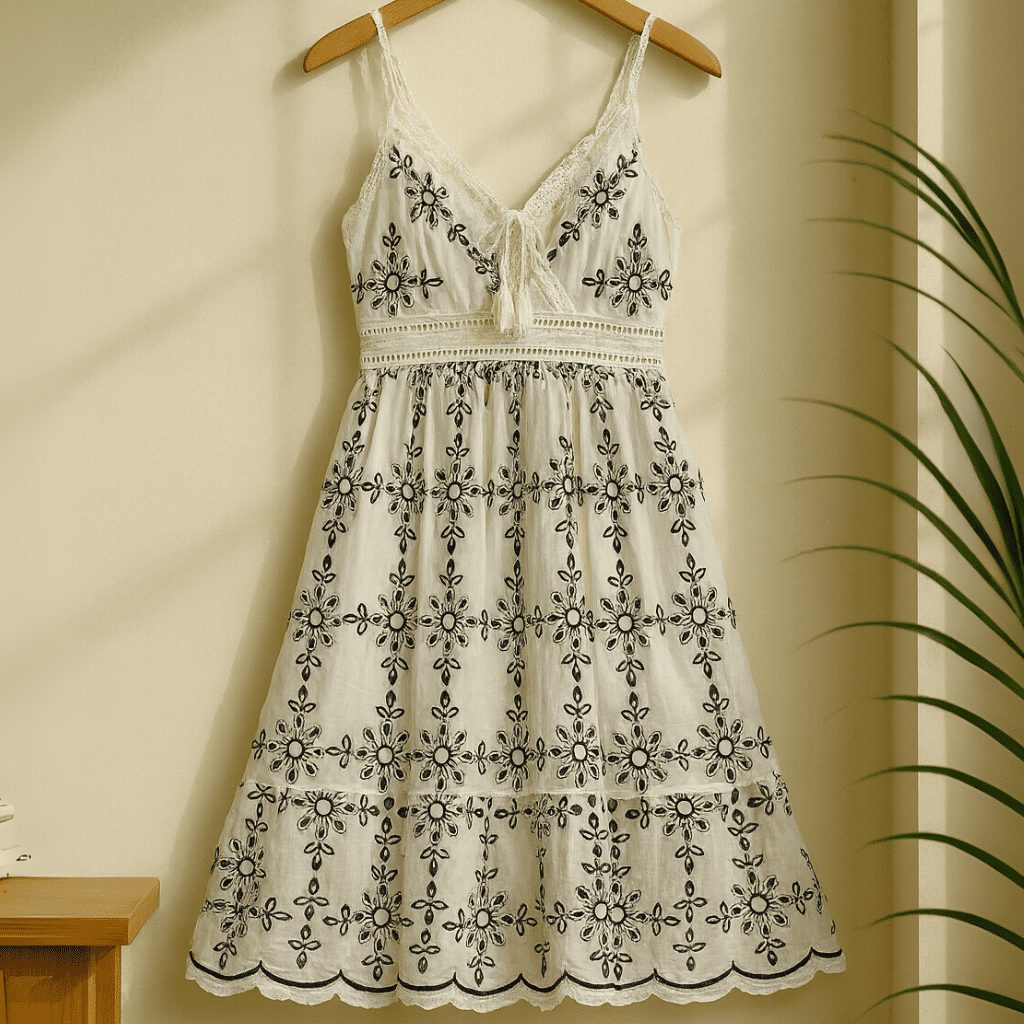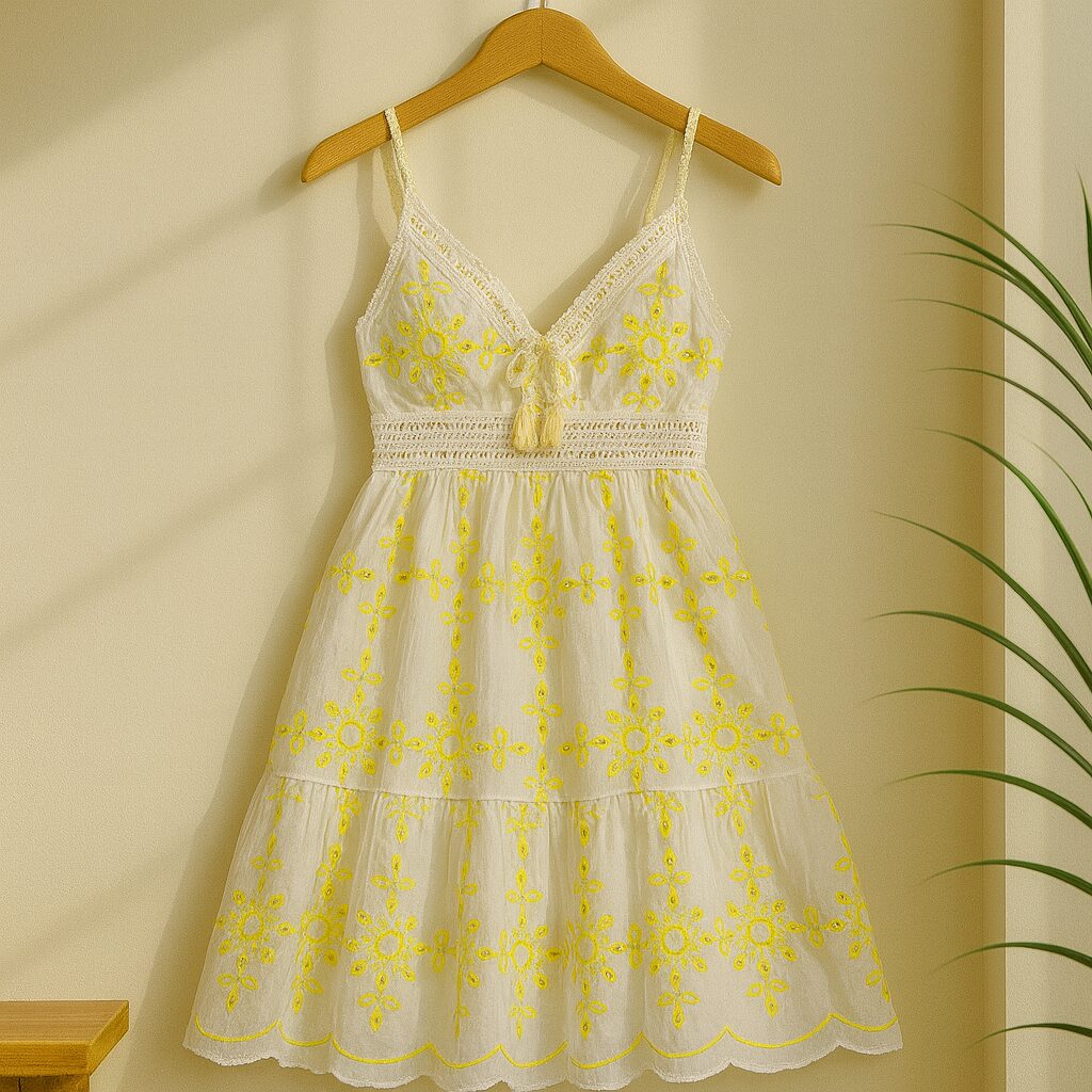 Delicado y femenino, este vestido de broderie confeccionado en algodón bordado combina frescura con un encanto romántico único. Su diseño de breteles finos y detalle de lazo en el escote realzan la silueta con sutileza, mientras que el bordado floral aporta textura y sofisticación artesanal.